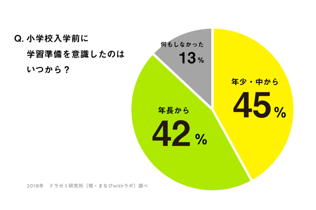 • 勉強開始時期は、「年少・中から」が45%、「年長から」が42%